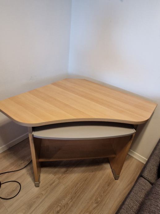 Kvalitetan kutni stol s policom za kompjuter, rupom za žice na gornjoj plohi i izvlačnom policom za tipkovnicu.