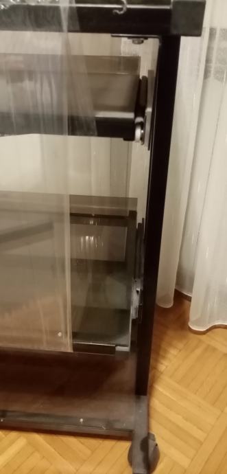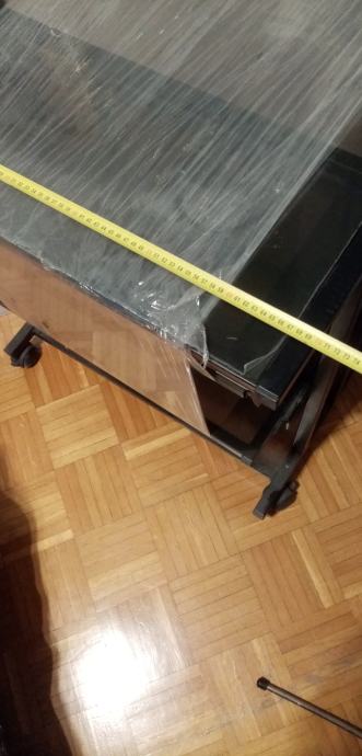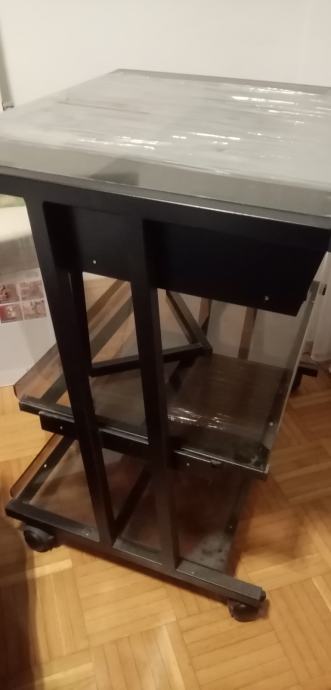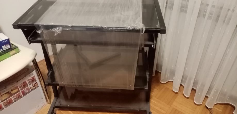 Nekorišteni uredski stol na kotačićima sa izvlačnim policama . Kombinacija kaljenog stakla i pleksi stakla na policama. Stol je Slovenske proizvodnje i kvalitetno napravljen. Dimenzije vidljive na slikama.