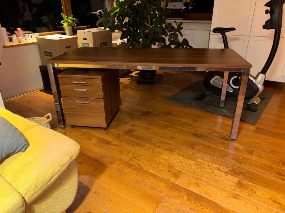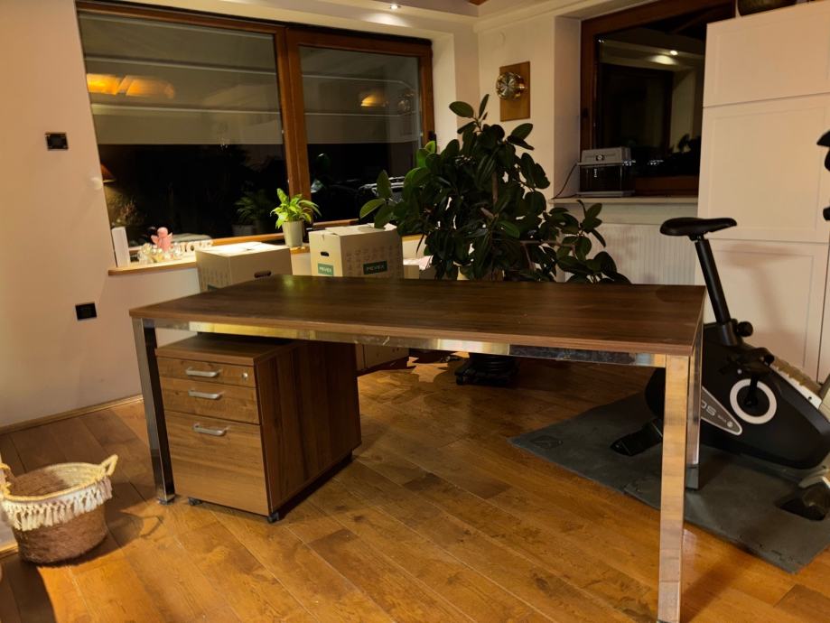 vrhunski posaći stol, robusan, čvrst, sa metalnom (niklovanom) konstrukcijom, dimenzije D=180 cm , Š=80 cm, sa pomičnim ormarićem na kotačićima. Kvalitetna izrada, boje oraha, bez ikakvih tragova oštećenja, kao nov. Prodajem jer mi zauzima previše prostora.