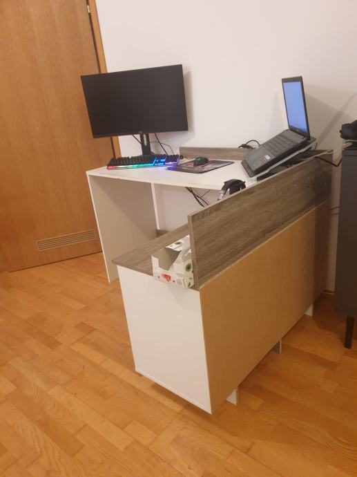 Prodajem kutni radni stol (u obliku slova L). Trenutno je montiran tako da su ladice na desnoj strani ali može se razmontirati i staviti u suprotan kut. Stol ima 3 ladice te prostor za odlaganje ili za stolno računalo. Na stolu nema tragova oštećenja osim tragovi korištenja (na mjestima malo izlizana boja). Materijal je iveral u bijeloj boji i boji hrasta.