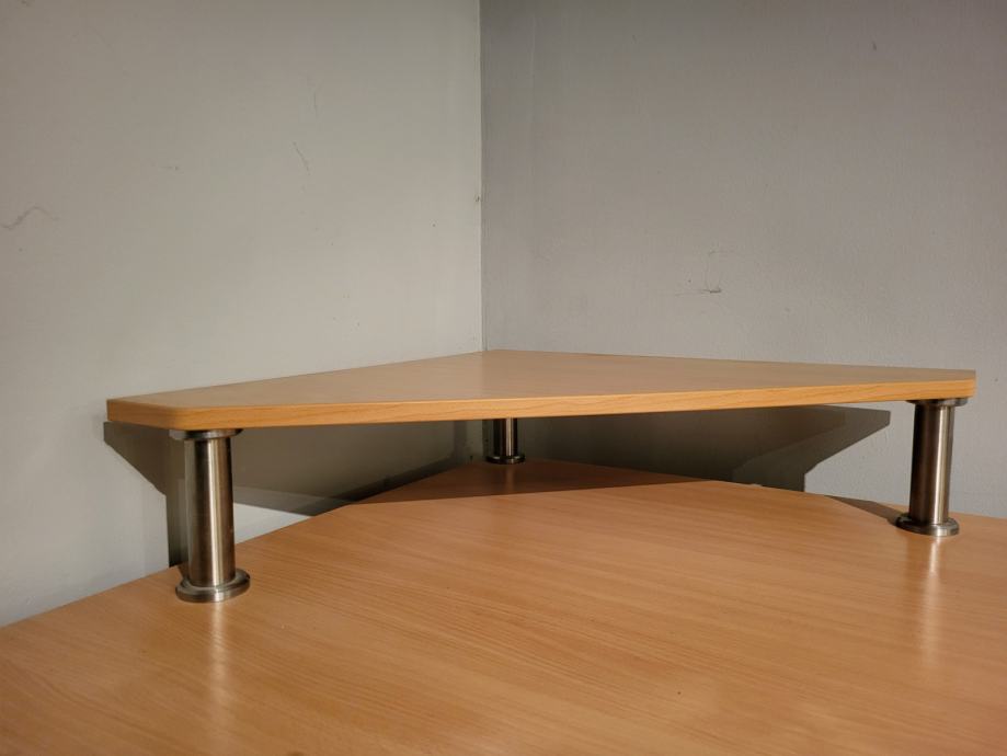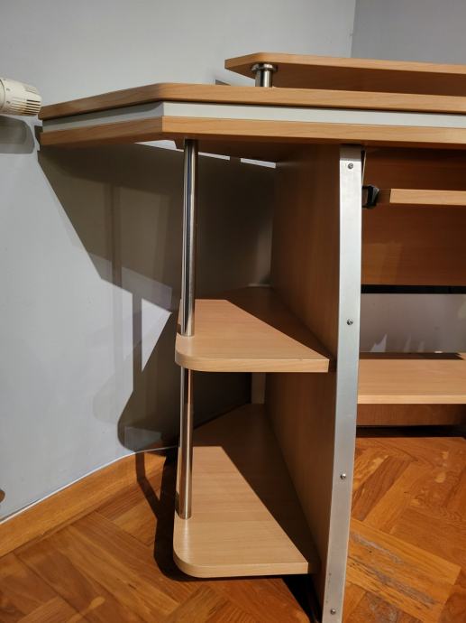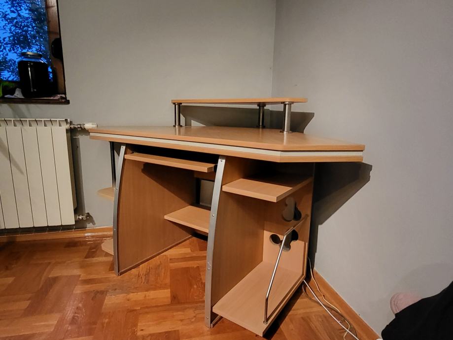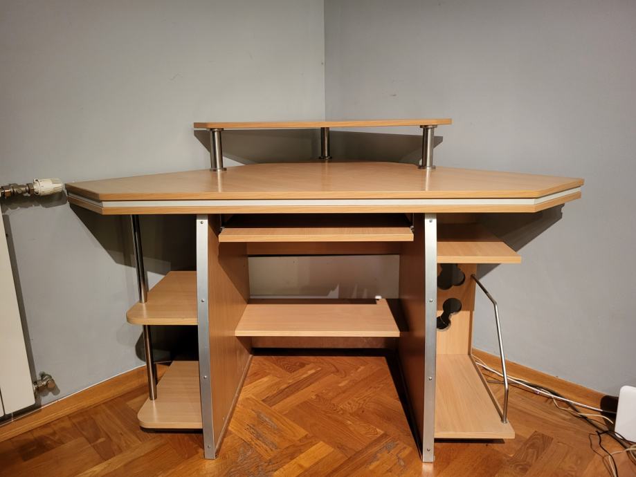 Prodaje se kutni radni stol. Dimenzije radne ploče 160x110 cm, a visina je 80 cm. Visina stalka za monitor je 17 cm. Stol je ručne izrade, rađen po mjeri.