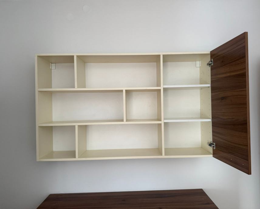 Namještaj je očuvan, stabilan i funkcionalan, modernog dizajna u kombinaciji svijetlog drva i tamnijeg dekora.