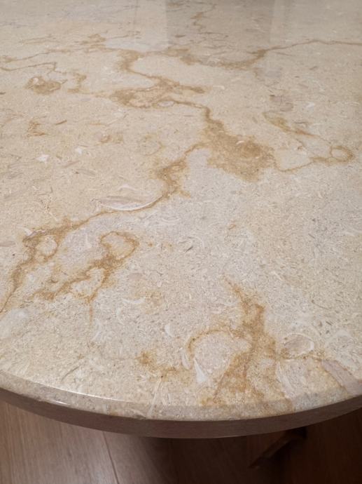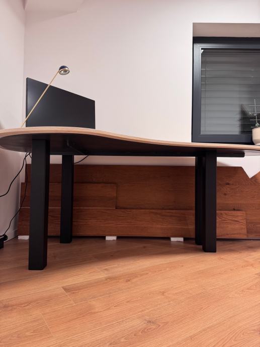 Prodajem radni stol izrađen od mramorne ploče s metalnom podkonstrukcijom i metalnim četvrtastim nogama. Mramor ručna obrada, debljine 20mm, poliran s gornje strane. Podkonstrukcija laserom izrezana pločevina debljine 5mm, prati krivulju kamena, uvučena od ruba 50mm. Kamen u širem dijelu cca 1200mm, u užem dijelu cca 600mm. Duljina 2150mm