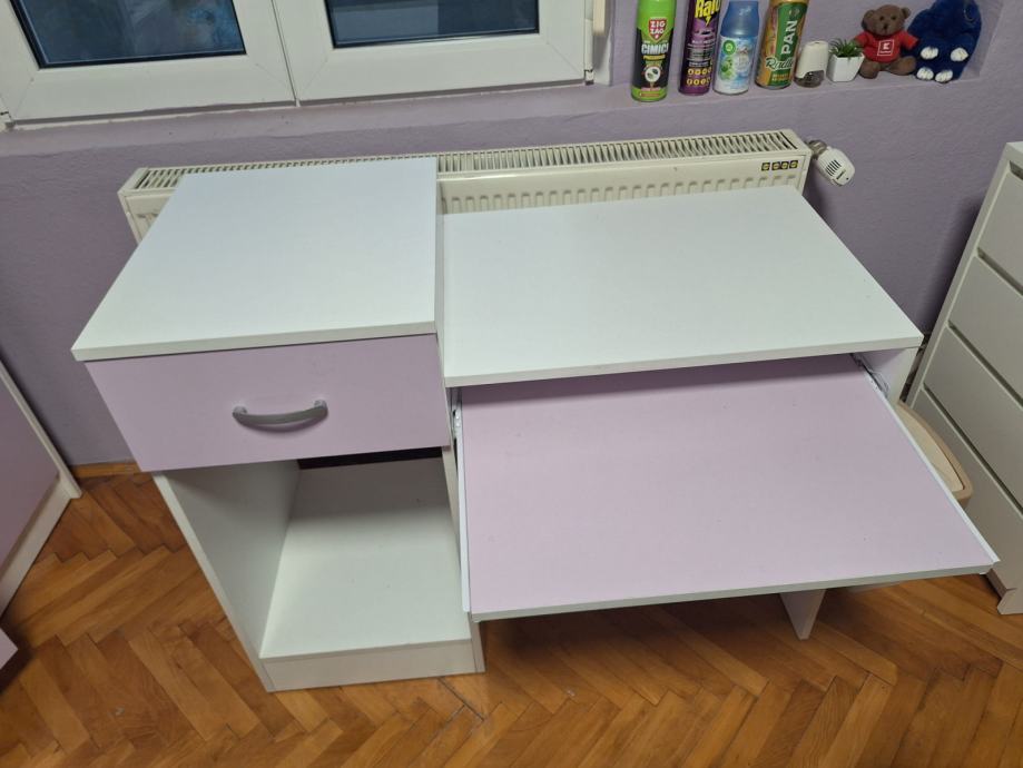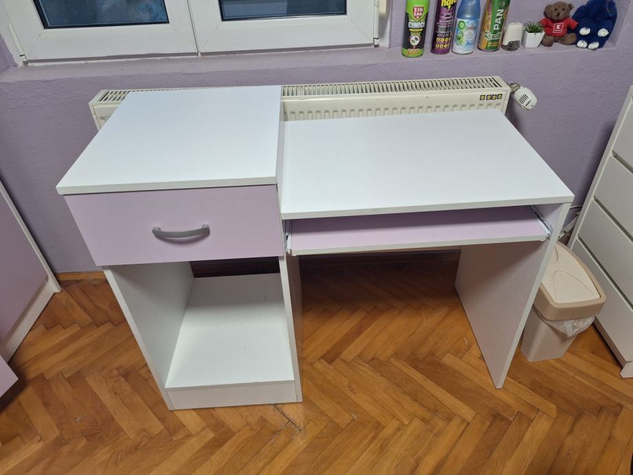 Radni stol bijelo ljubičaste boje.Donja ladica se izvlači.Rabljen u dobrom stanju.