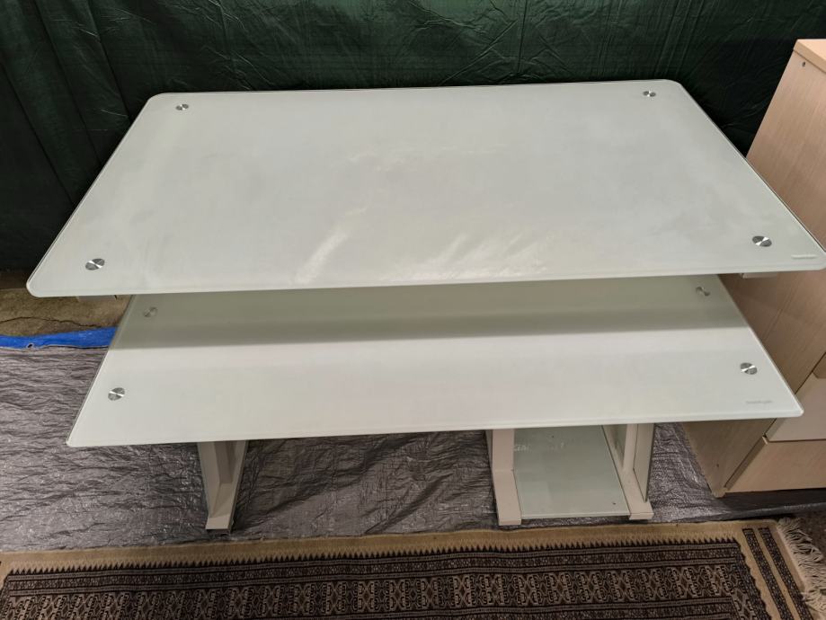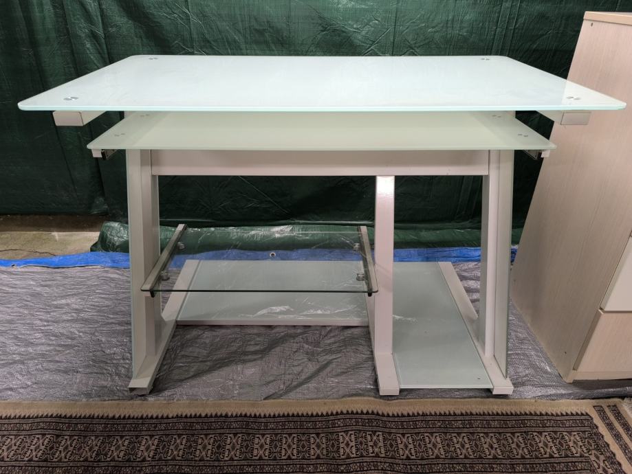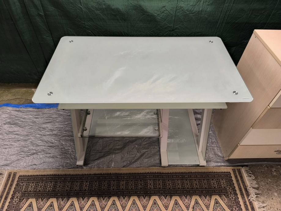 Prodajem radni stol s bijelom staklenom radnom površinom i metalnim nogama u bijeloj boji. Stol ima izvlačnu policu ispod glavne radne površine, koja je praktična za tipkovnicu ili dodatni pribor, te staklenu policu pri dnu konstrukcije. Solidna i stabilna izvedba, prikladno za ured ili radnu sobu.Stol je stakleni.