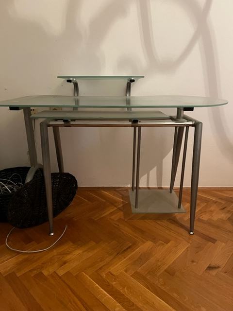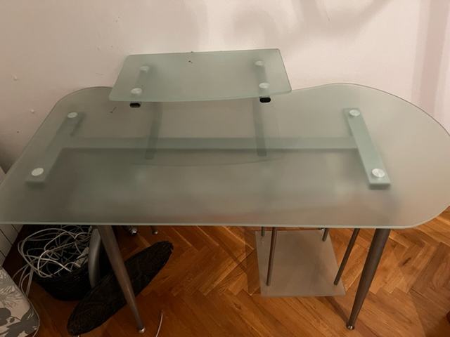 Prodajem stakleni uredski stol (radna površina 120 x 63 cm) s povišenim dijelom za monitor (50 x 30 cm).