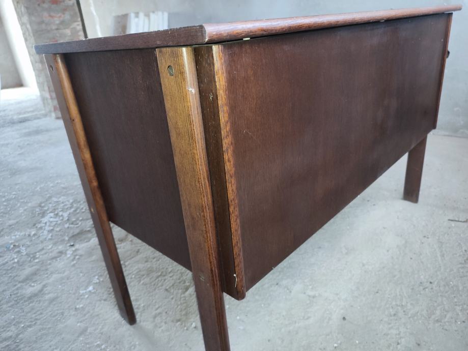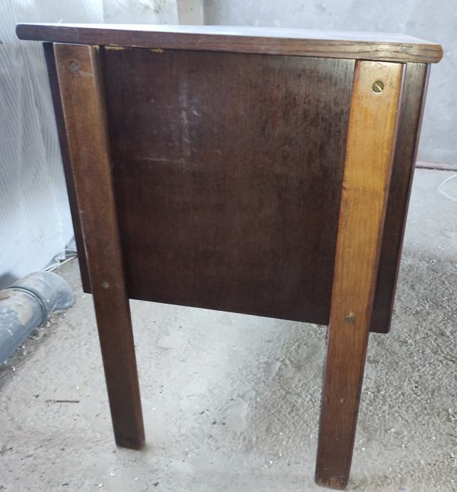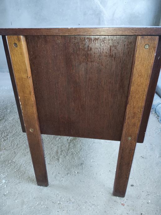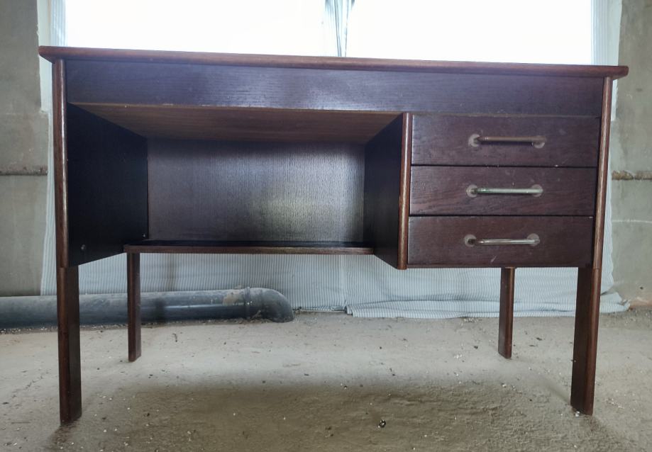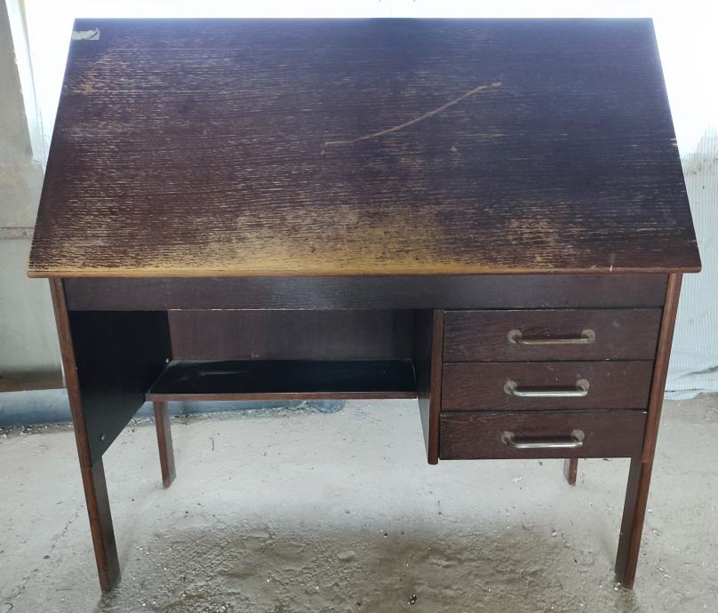 Starinski radni stol s 3 ladice, koji je ujedno stol za crtanje s nagibom. U dobrom je i ispravnom stanju, osim što bi ga s vanjske strane trebalo urediti (pobrusiti, ofarbati u boju po želji)