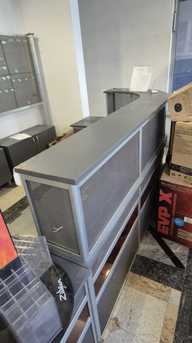 Lučni pult 1500/2600x600x750 od aluminijskih profila sa prednjom stranom zatvorenom u kombinaciju perforiranog tamno sivog lima i crvenog pleksiglasa, prepuštenom gornjom plohom iverala debljine 25mm, te nadogradnjom visine 43 cm zatvorenom u perforaciju sa prednje i bočnih strana.