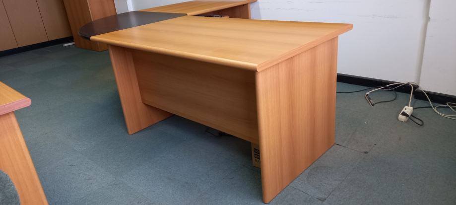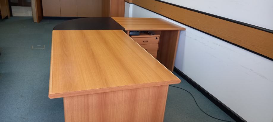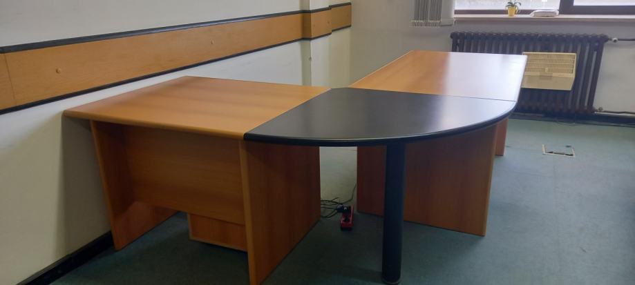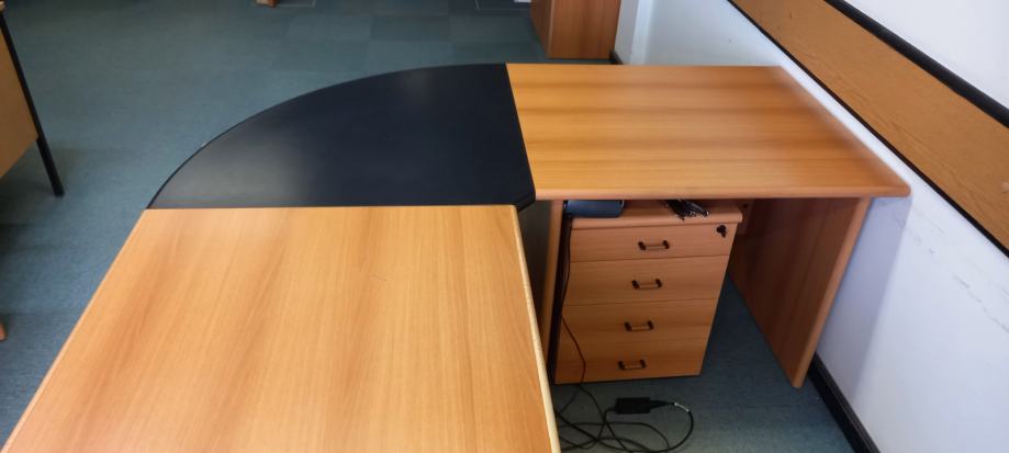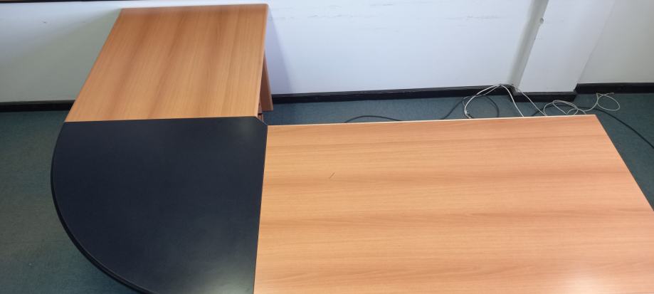 Prodajem uredski stol koji se sastoji od dva spojena stola u vrlo dobrom stanju. Dimenzije većeg stola su 80 cm širina x 134cm dužina, a manjeg 80x90cm, a spaja ih crni trokut. Budući da stolovi mogu i samostalno stajati, moguća je i pojedinačna prodaja nekog od stolova. Uz stol postoji i ormarić s ladicama na kotačićima.