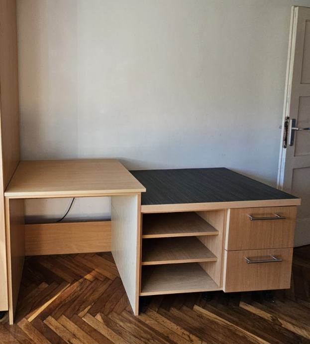Uredski stol koji se sastoji od dva dijela, radne povrsine i elementa za pohranu. Od iverala egzoticnog drvnog dekora i bukve. Elemet za pohranu ima dio s policama i dio s ladicama. Dimenzije stola u cm: visina 74, sirina 72, dubina 60. Dimenzije elementa za pohranu: visina 64, sirina 91, dubina 60. Dva komada. Cijena prikazana za jedan.