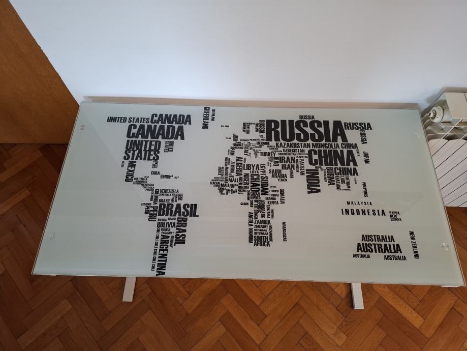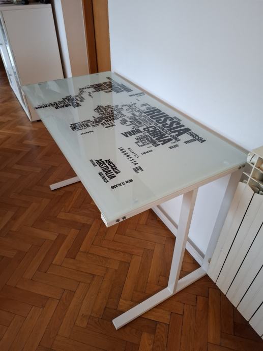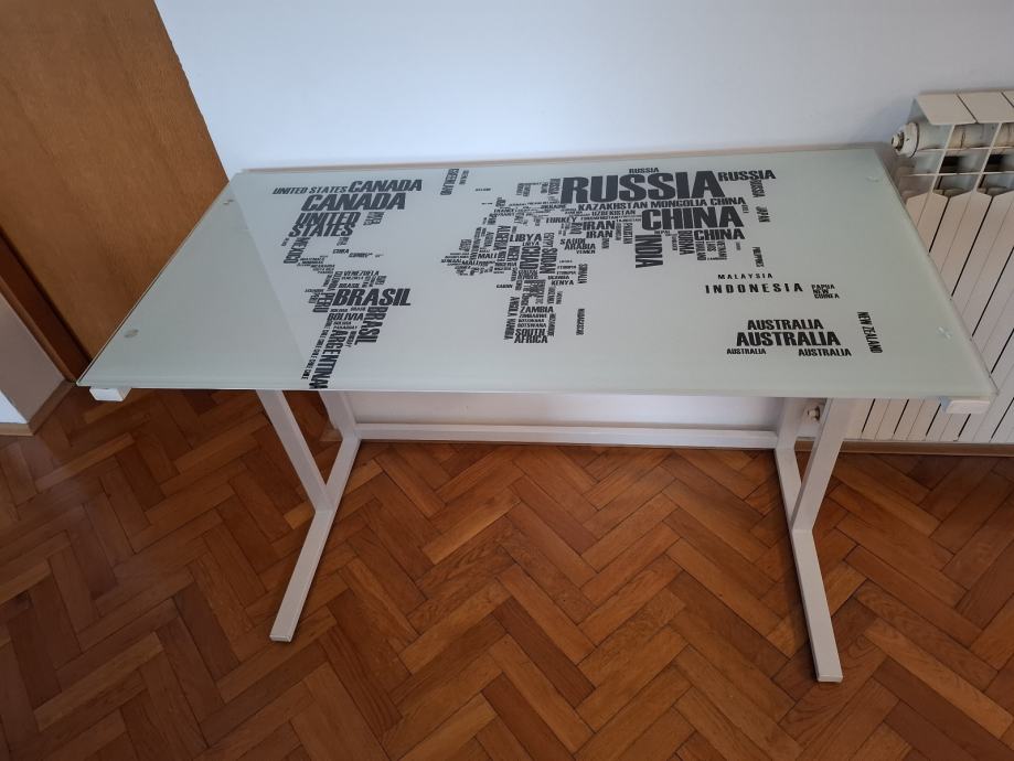 Prodajem uredski stol s staklenom radnom površinom na kojoj je otisnut dizajn karte svijeta s nazivima država. Noge stola su bijele boje, a staklena ploča ima svijetlu, mat završnicu koja lijepo kontrastira s tamnim slovima na karti. Stol je kompaktan i stabilan, pogodan za rad za računalom ili kao pisaći stol. Dimenzije 105 × 55 × 75 cm.