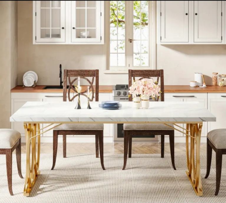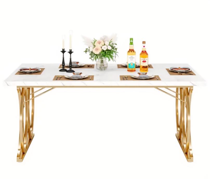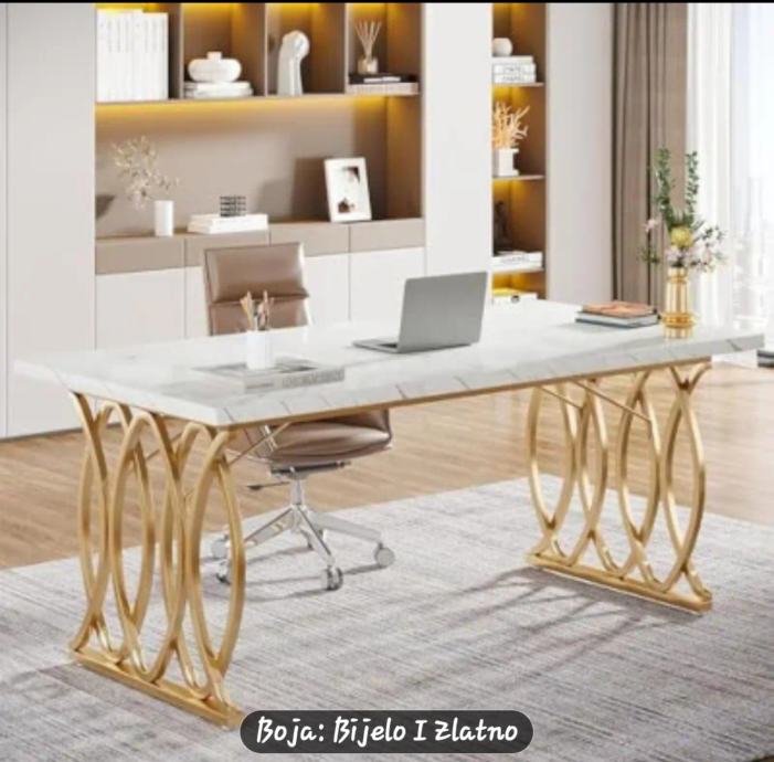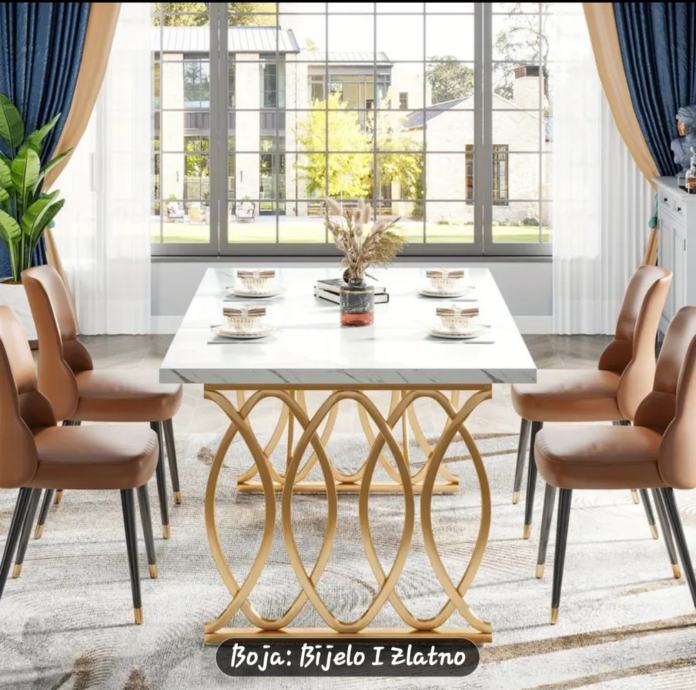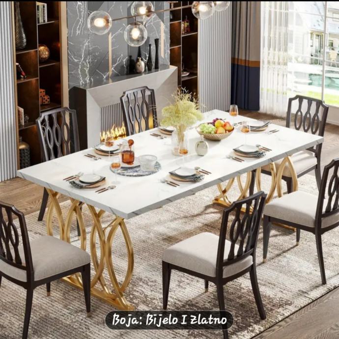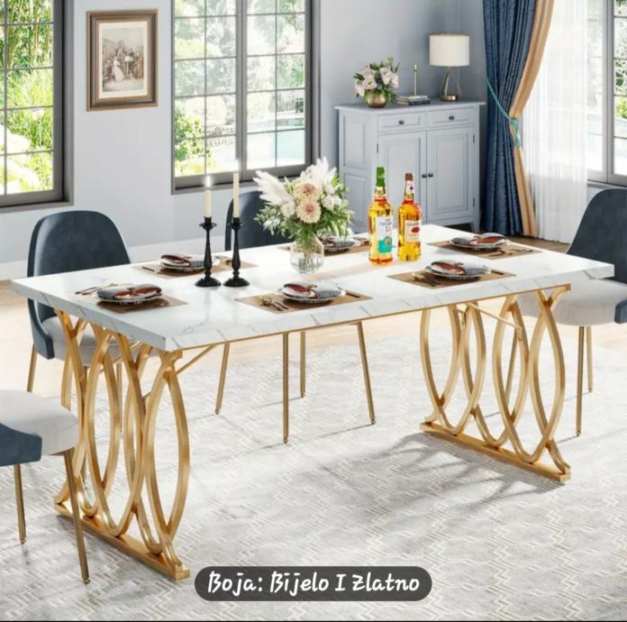 Prodajem novi, zapakirani stol moderne kombinacije bijele i zlatne boje. Ploča stola je bijele boje s mramornim uzorkom, a podnožje je izrađeno od metala u zlatnoj boji s dekorativnim kružnim detaljima koji daju stolu elegantan izgled.