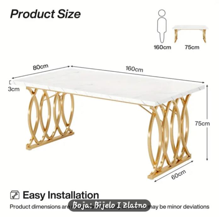 Dimenzije stola su 160 x 80 cm, visina 75 cm, a debljina ploče iznosi 3 cm. Montaža je jednostavna.