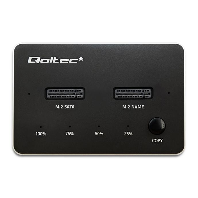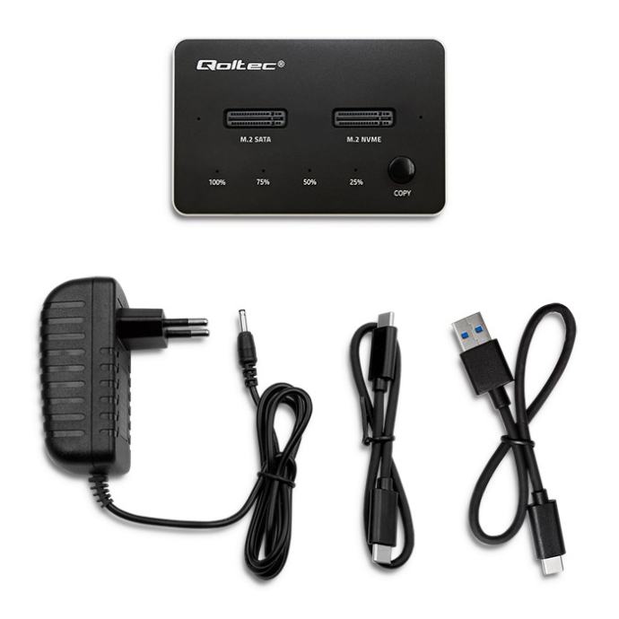 Stanica je kompatibilna s M.2 diskovima sa SATA i NVMe sučeljima. Nudi brzine prijenosa podataka do 10 Gbps. Uz to, Qoltec disk stanica je uređaj: