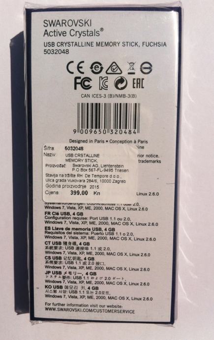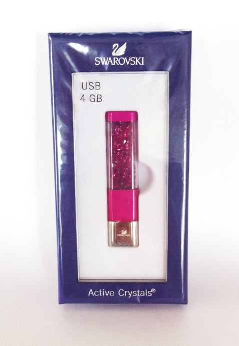 Novi, zapakirani Swarovski USB stick fuksija boje. Ima pripadajuću poklon vrećicu i potvrdu autentičnosti. Cijena mu je u dućanu 399 kn, a kako je zapakiran bit će idealan poklon. Kristalići unutar njega se prekrasno presijavaju, a još je ljepši uživo naravno. Kapacitet je 4GB, dužina je skoro 7 cm. Za sva dodatna pitanja slobodno kontaktirajte