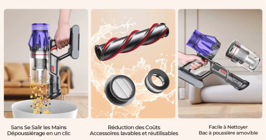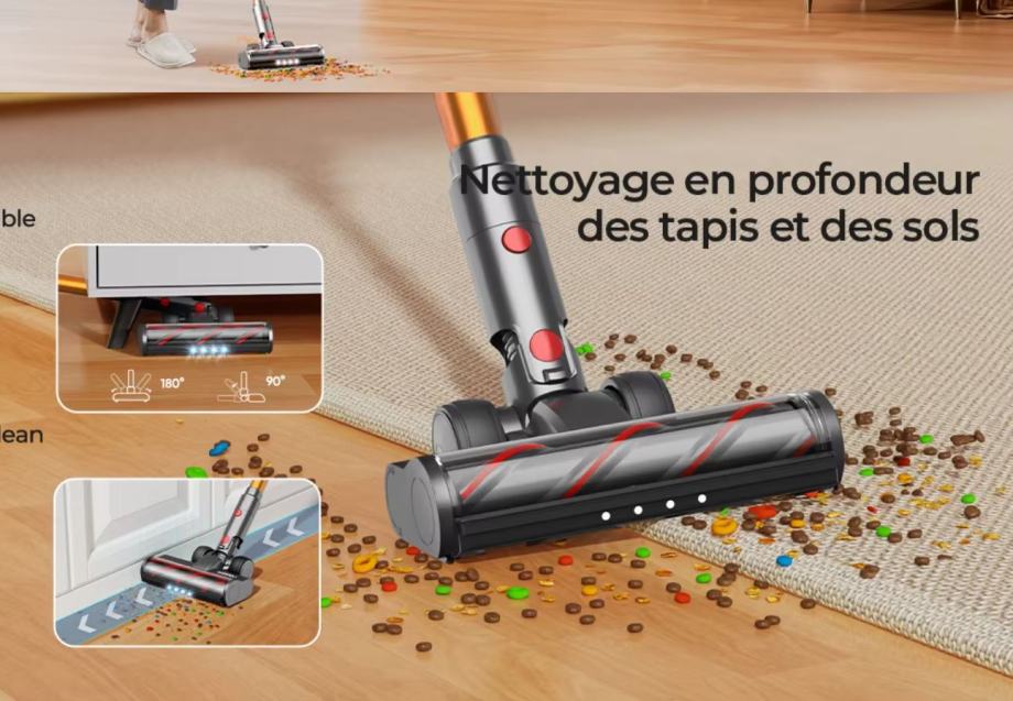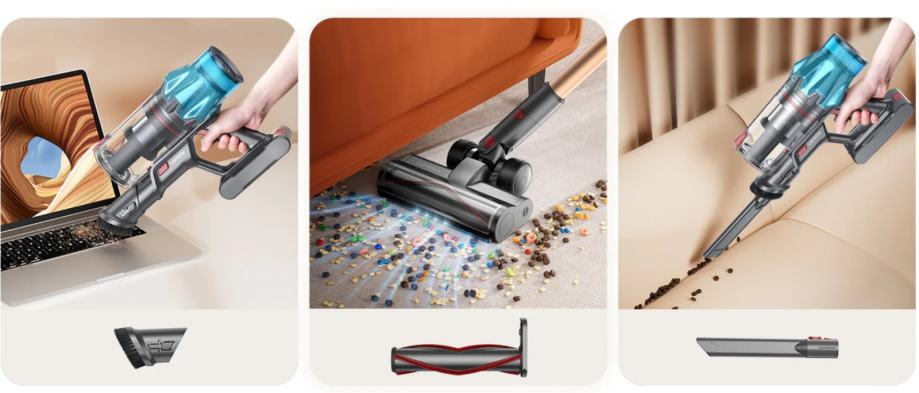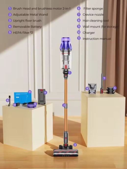 Bežični usisavačopremljen je rolom s mekim i tvrdim čekinjama, što smanjuje čestu zamjenu valjka i trošenje električne četke za pod. Opremljen uvlačivom aluminijskom cijevi, četkom za pukotine i okruglom četkom, tako da ga možete koristiti na visokim mjestima, stepenicama, pukotinama, pločama stolova itd.