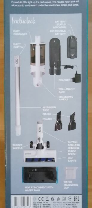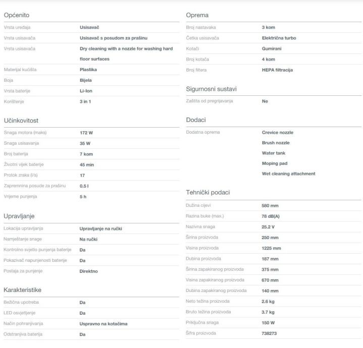 Oprema: Mlaznica za pukotine, Četka, Dodatak za mokro čišćenje, Podloga za moping, Spremnik za vodu