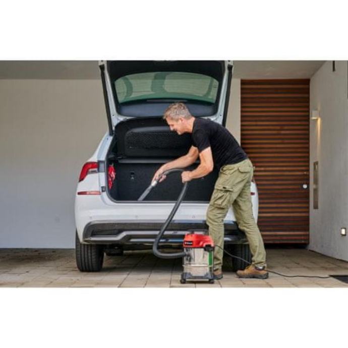 Einhell TC-VC 1812/1 S mokro/suhi usisavač snažan je i svestran alat za čišćenje različitih površina u radionici, garaži i drugim prostorima. Snagom od 1250 W učinkovito uklanja prašinu, prljavštinu, ali i tekućine. Opremljena je posudom od nehrđajućeg čelika zapremnine 12 litara koja omogućuje dugotrajnu upotrebu. Usisavač uključuje crijevo dužine 1,5 m (Ø 36 mm) i 3-dijelnu plastičnu mlaznicu, koja omogućuje širok doseg tijekom čišćenja.
