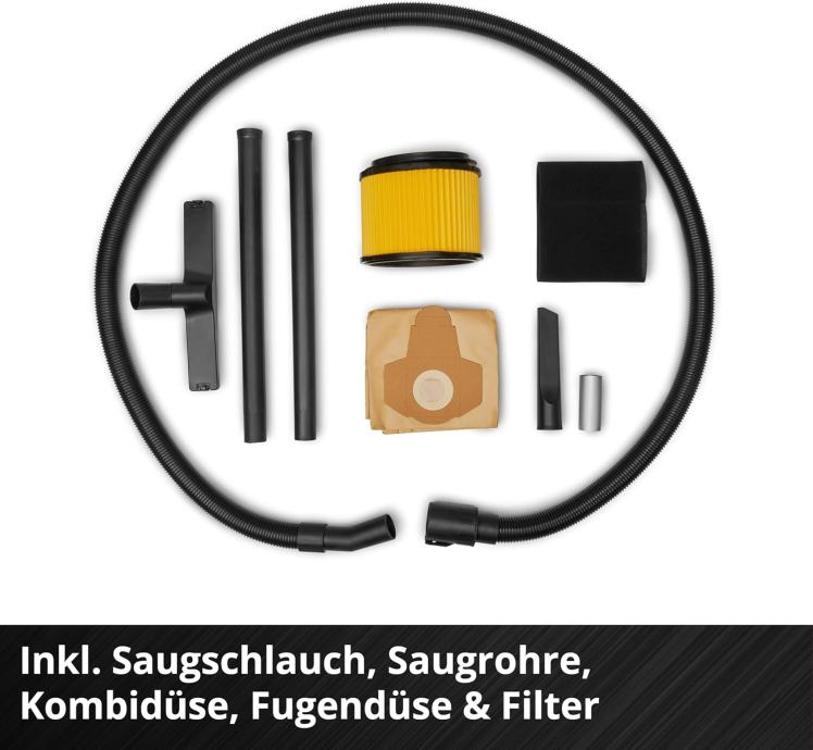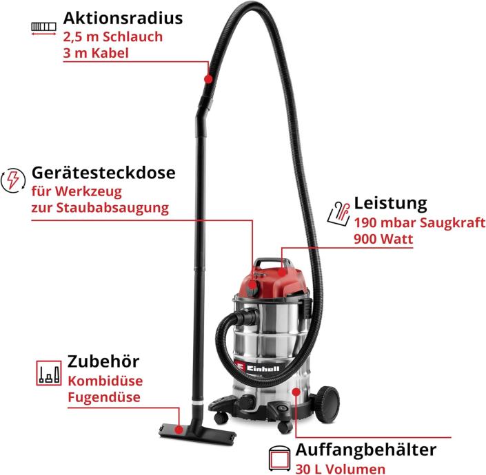 Snažan Einhell usisavač za mokro/suho čišćenje TC-VC 3055 SA savršeno je prilagođen temeljitom čišćenju kuće, radionice i garaže. S 900 W snage i usisnim kapacitetom od 190 mbara, pouzdano uklanja prašinu, prljavštinu i tekućine s raznih površina. Usisavač je opremljen robusnom posudom od nehrđajućeg čelika kapaciteta 30 litara. Integrirani je vijak za ispuštanje vode za jednostavno pražnjenje apsorbiranih tekućina. Sustav crijeva Ø 36 mm osigurava visoku razinu protoka zraka i prljavštine. Priključak za puhanje koristi se za puhanje teško dostupnih mjesta, npr. kutova i pukotina. Veliki kotači i valjci te ručka za nošenje osiguravaju jednostavan transport i fleksibilnost u radu. Osim toga, u kućište je integrirana automatska utičnica za uređaje na koju se mogu spojiti električni alati. Ako se spojeni alat sada uključi ili isključi, usisavač za mokro/suho čišćenje također će se automatski uključiti ili isključiti ili s malim zakašnjenjem. Praktični držači za pohranu pribora i kabela na kućištu osiguravaju njihovo uredno korištenje. Uključeno je usisno crijevo od 2,50 m, dvodijelna produžna cijev, kombinirana mlaznica za tepihe i tvrde podove te mlaznica za pukotine. Osim toga, s priloženim pjenastim filterom, naboranim filterima i papirnatom vrećicom za skupljanje prljavštine, možete odmah započeti s mokrim i suhim usisavanjem.