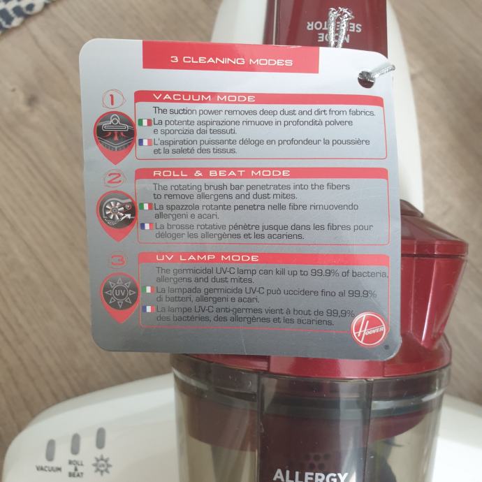 Također je prikladan za sve osobe s kućnim ljubimcima jer učinkovito uklanja životinjsku dlaku i drugu prljavštinu koju naši kućni ljubimci ostavljaju iza sebe. Ultra Vortex usisavač dobio je certifikat za izvrsnost agencije za alergije u Velikoj Britaniji. Usisavač Hoover MBC 500UV omogućuje tri načina dubinskog čišćenja, možete koristiti sva tri odjednom ili zasebno.
