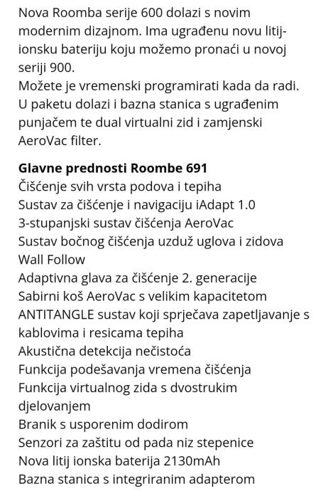 Prodajem robotski usisivač Roomba 691, kratko koristen, očuvan, Wifi..., za 199€.