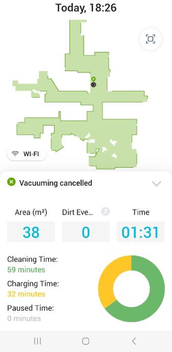 Baterija traje 1h (slika stavljena kao dokaz), nakon toga ako robot nije zavrsio vraca se na punjenje (cca 2h) i nastavlja dalje usisavati.