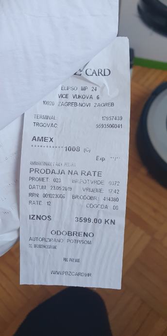 iRobot Roomba e5 kupljena u svibnju 2019. po cijeni od 3599 kn, s novom bočnom četkicom i dvije rezervne, rezervnim filterom i virtualnim zidom. Garancija joj je istekla, no radi bez greške i ima samo manje tragove korištenja (ogrebotine) na bumperu. Perivi spremnik, upravljanje moguće i putem aplikacije.