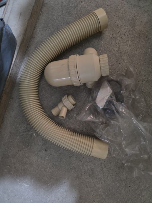 prikazan odvodni set za perilicu rublja, koji uključuje fleksibilno crijevo i pripadajući sifon.