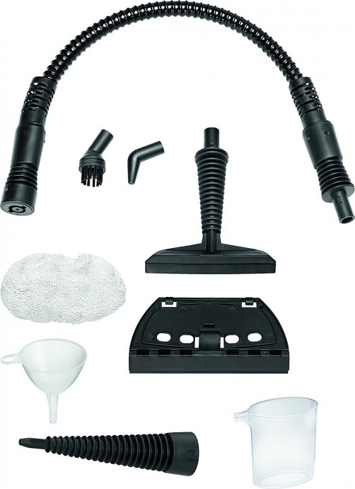 Uključuje 9 dodataka: četka, 360° okretni mlazni nastavak, kutni nastavak, krpica i nastavci za čišćenje prozora, crijevo, mjerna posuda za vodu, lijevak
