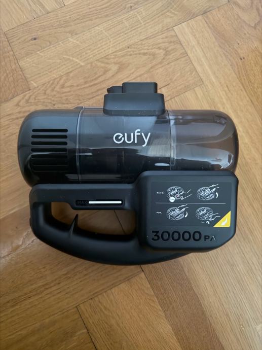 Usisavač dolazi s produljenjem za teško dostupna mjesta, a baza omogućava samostalno punjenje i automatsko pražnjenje spremnika za prašinu što olakšava održavanje. Crno-siva boja s prepoznatljivim Eufy dizajnom.