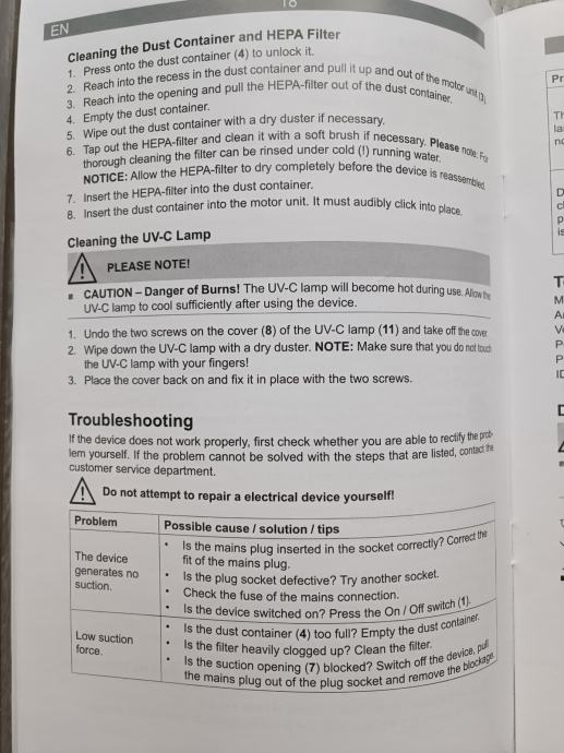 Uklanja 99,9% grinja s EPA filterom i UV-C svjetlom (280 nm) – ubija gotovo sve grinje, bakterije i alergene itd.