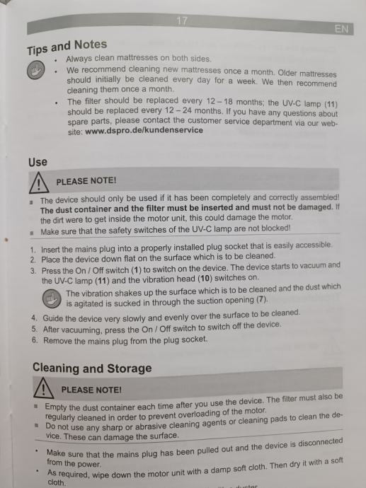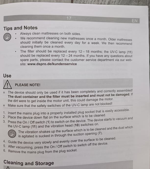 Filtarski sustav, koji se sastoji od perivog EPA filtra i spremnika za prašinu od 300 ml osigurava pouzdanu sterilizaciju. To čini usisivač protiv grinja idealnim suputnikom za miran noćni san – za alergičare i cijelu obitelj. Vibracijski usisivač za grinje CLEANmaxx – za miran noćni san bez dosadnih grinja, alergena i ostalog.