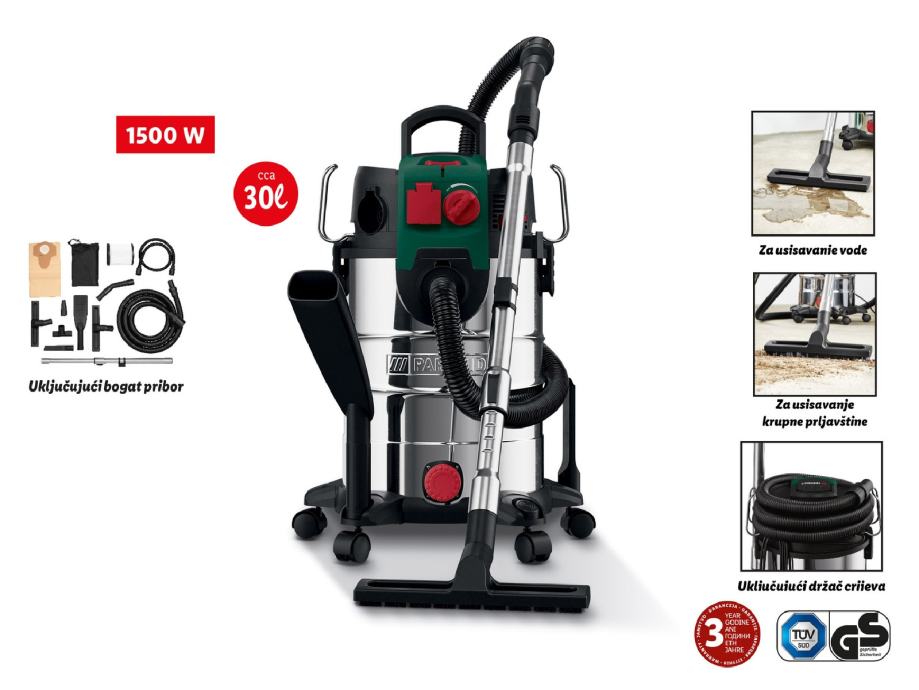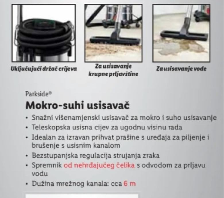 Prodajem mokro-suhi usisavač snage 1500W s kapacitetom spremnika od 30 litara. Usisavač ima teleskopsku usisnu cijev za ugodnu visinu rada i dolazi s bogatim priborom koji uključuje različite nastavke za usisavanje suhog i mokrog sadržaja.