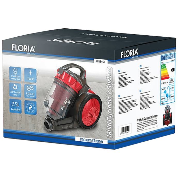Usisavač sa posudom, 700 W, HEPA 13 filter. Usisavač sa posudom, snaga 700 W, kapacitet posude za prašinu 2.5 lit, HEPA 13 filter, multi sustav filtriranja, perivi unutarnji filter, razina buke 79 dB. Jednostavan mehanizam pražnjena posude za prašinu, 360° zglob za maksimalnu fleksibilnost crijeva, metalna teleskopska cijev, četka 2in1, ergonomska drška