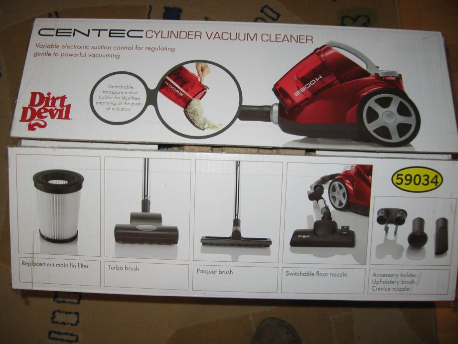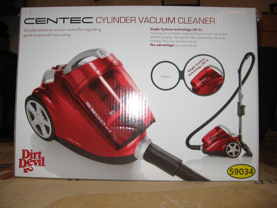 Dirt Devil Centec, maksimalna snaga 2300w, usisivač bez vrećice s turbo ciklonskim sustavom SC2, perivi, higijenski HEPA filter, metalna teleskopska cijev, uključeni svi nastavci, originalna kutija sa svom opremom.