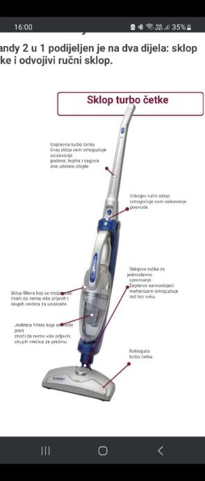 Pogodan za sve vrste čišćenja. Manji dio odvojivi koristite za usisavanje po stolu i slično. Ima svoj stalak.