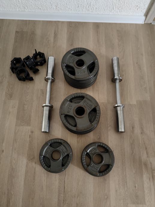 Prodajem 2 olimpijske šipke promjera 50 mm, 4 utega od 2, 5 kg širine 50 mm, 12 utega od 5 kg širine 50 mm, 4 zaštitne hvataljke. Sve je u odličnom stanju. Prodaje se jer nema više mjesta za to.