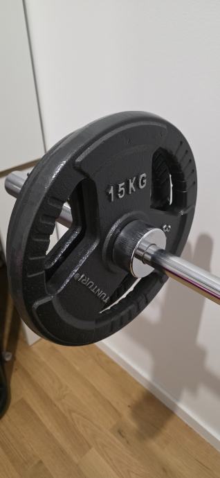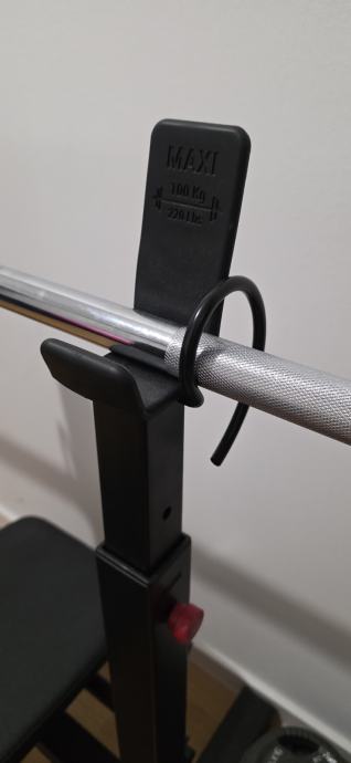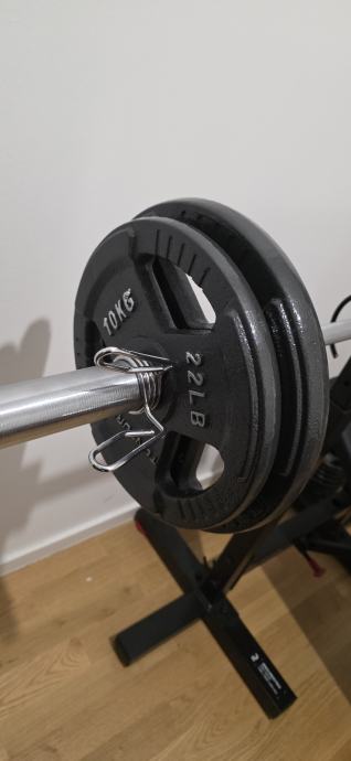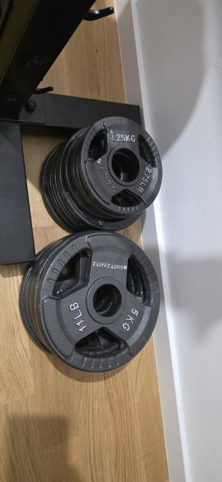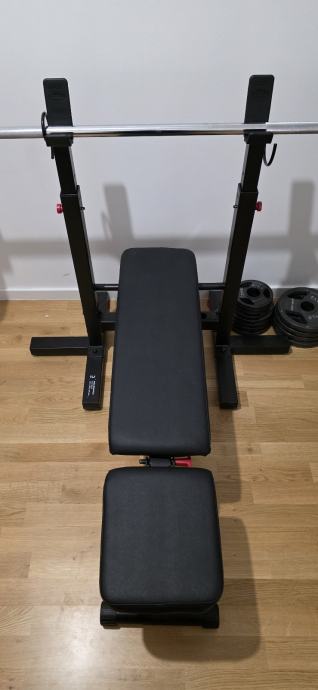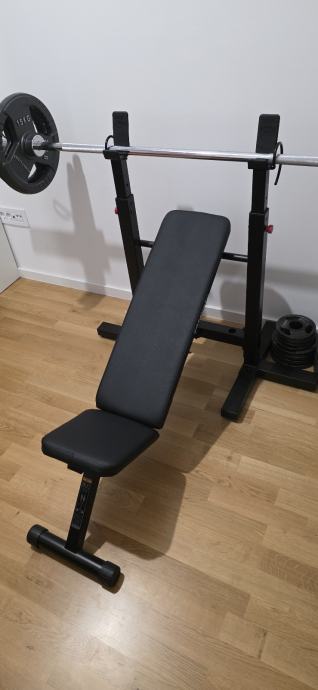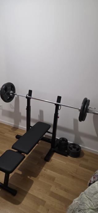 Prodajem bench za vježbanje zajedno s kompletnim setom utega ukupne težine 100 kg. Bench je crne boje s podesivim naslonom i stabilnim stalkom za šipku. U kompletu dolaze olimpijska šipka te ploče različitih težina, uključujući 15 kg ploče marke Tunturi. Bench se moze namjestiti na ravni i kosi. Stanje doslovno kao novo.