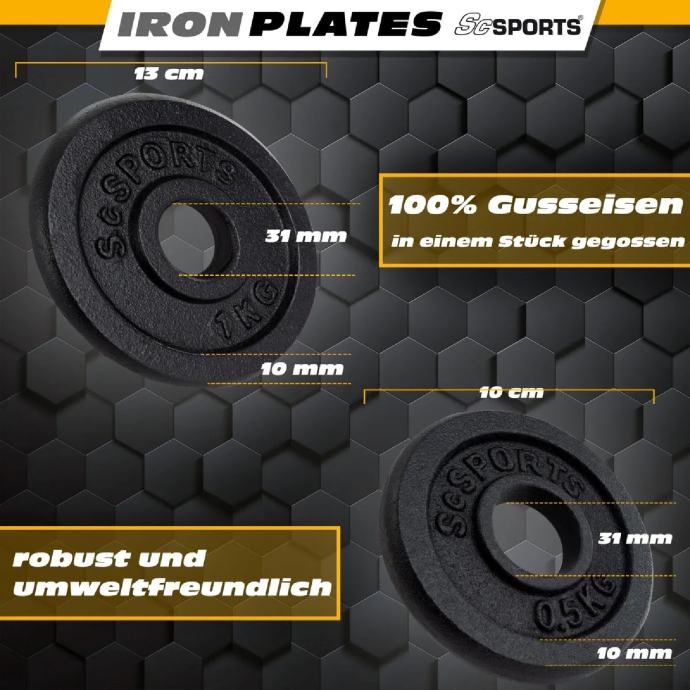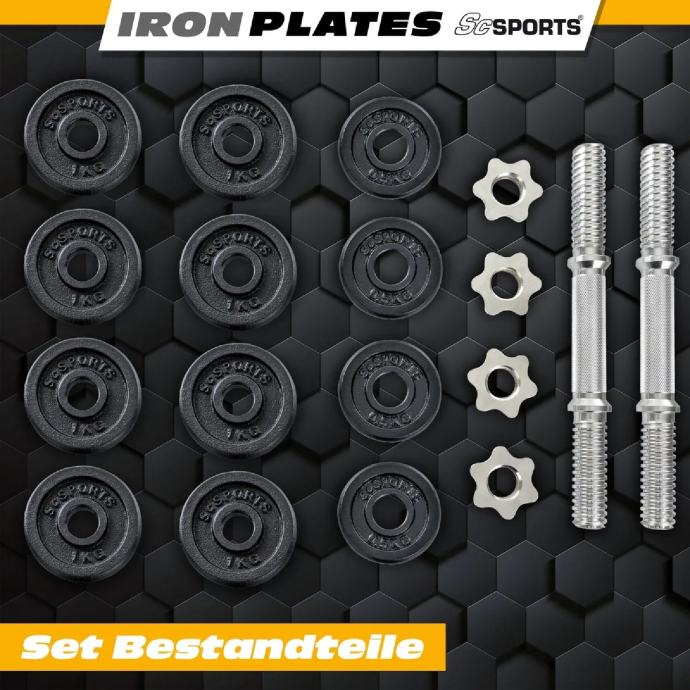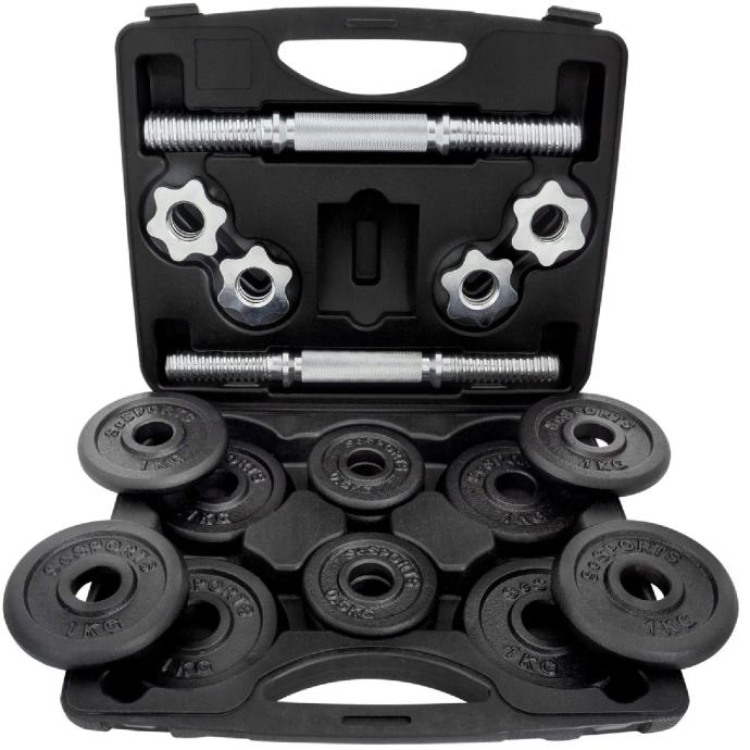 U ovom profesionalnom setu pronaći ćete dvije šipke s bučicama i dvanaest ploča s utezima (4 x 0,5 i 8 x 1 kg), a sve se lako može pohraniti u priloženi kovčeg. Sama bučica izrađena je od visokokvalitetnog lijevanog željeza i ima nazubljene površine za držanje kako bi osigurali siguran hvat tijekom vježbanja.