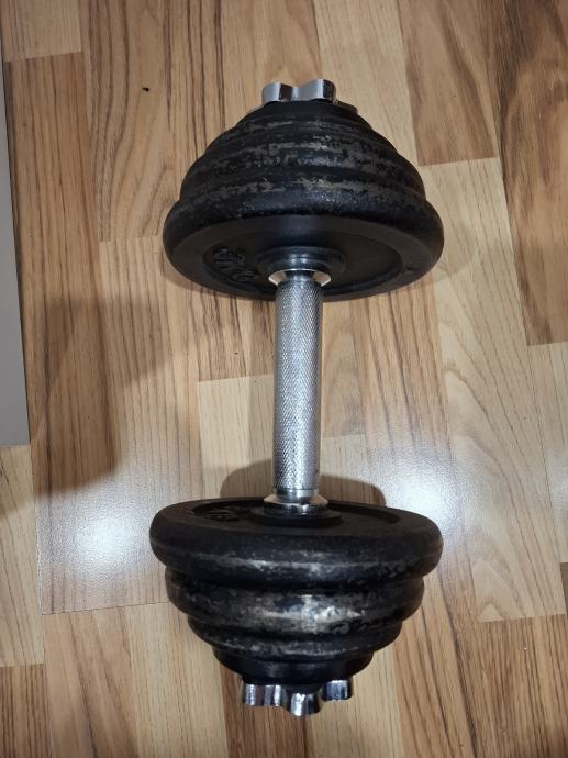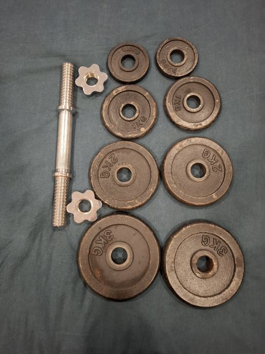 Šipka i 8 utega. 15 kg. Korišteni, ali u dobrom stanju.