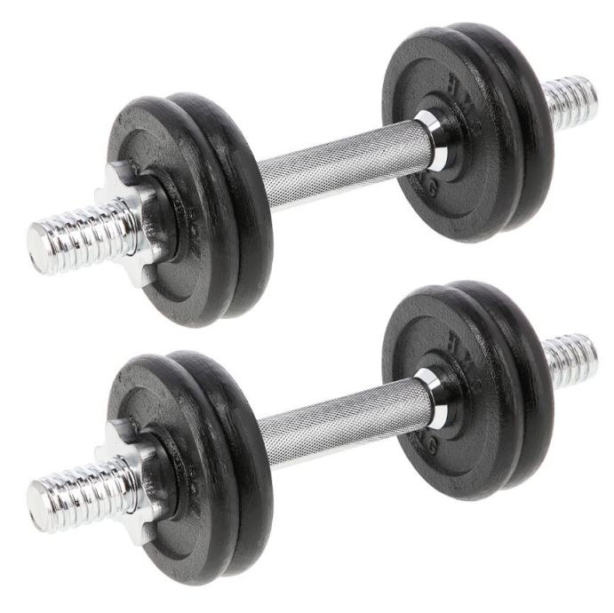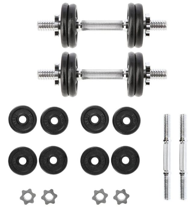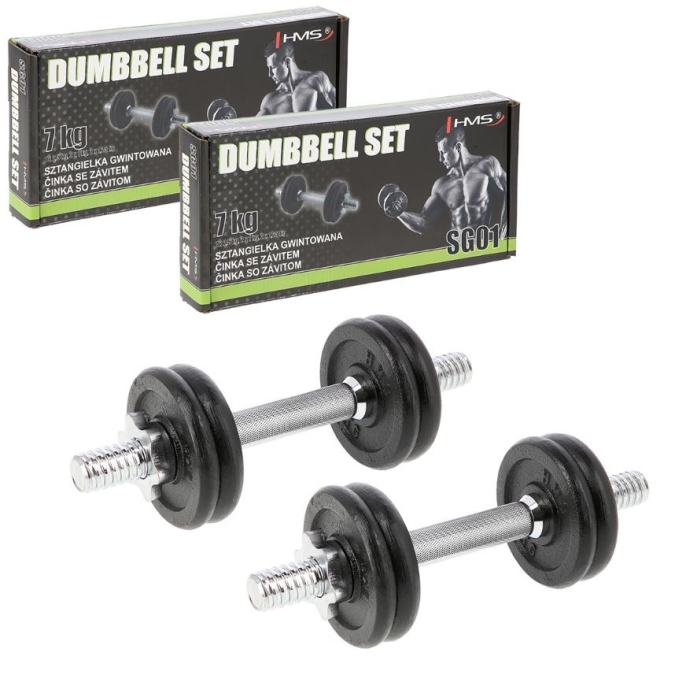Par bučica 2x7 kg. Ručica ima hrapavu protukliznu površinu. Diskovi su uključeni u paket.2x 7kg (2x šipka 35 cm, diskovi: 4x 0,25 kg, 4x 1 kg, 4x 1,25 kg), ukupno 14 kgPromjer drške: 30 mm