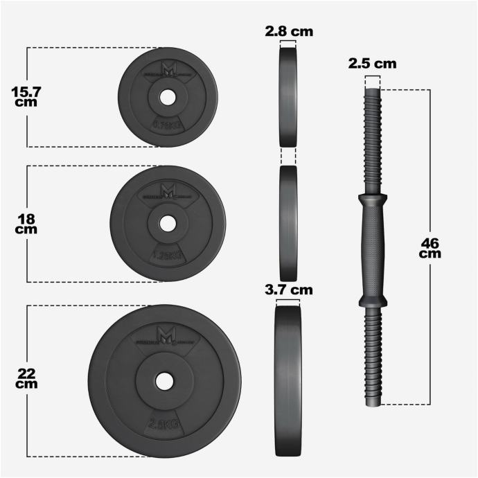 Set s 2 šipke za bučice i 16 utega (0,75-2,5 kg)