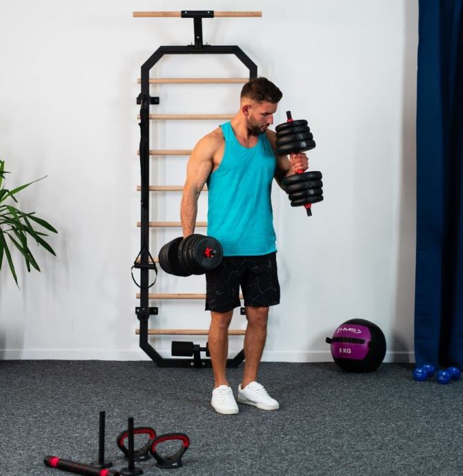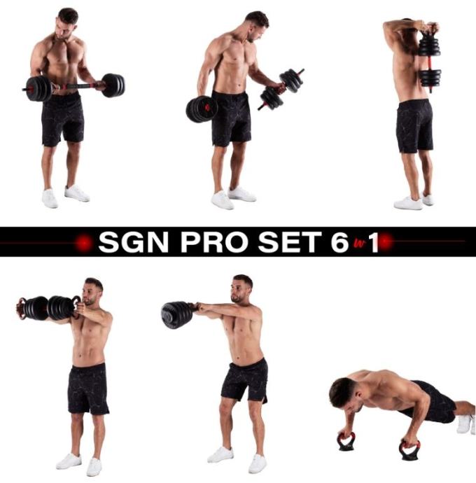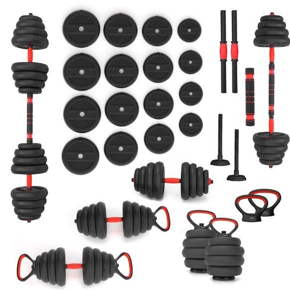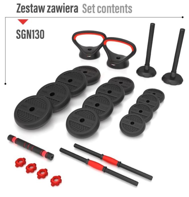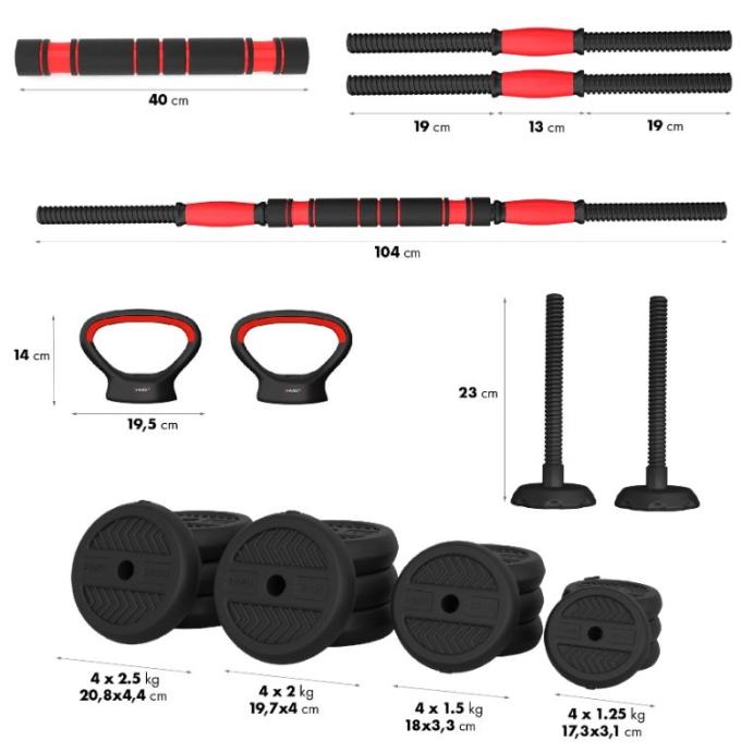 Fitness utezi od 40 kg omogućuju vrlo raznoliko vježbanje. Kvalitetan materijal osigurava visoku izdržljivost. Diskovi su presvučeni PVC materijalom za dodatnu zaštitu. Stezaljke i savršeno usklađen promjer otvora diska omogućuju brze promjene težine. Stezaljke su navojne, ali imaju dodatno pojačanje, tako da se teret ne pomiče tijekom vježbanja. Dvije kratke šipke mogu se kombinirati u jednu dugačku. Ovo inovativno rješenje značajno proširuje mogućnosti vježbanja. Sve ručke i šipke opremljene su protukliznim materijalima. Vezni dio prekriven je ergonomski dizajniranom pjenom za maksimalnu udobnost tijekom vježbanja.Materijal: PVC + čelik + cementDimenzije šipke:Duljina: 55 cmDuljina dijela za hvatanje: 13 cmPromjer: 28 mmDimenzije produžetka:Duljina: 40 cmPromjer: 45 mmDimenzije ručki (nosača):Duljina: 19,5 cmVisina: 14 cmPromjer: 25 mmTežina: 0,35 kgDimenzije stalka za kettlebell:Visina: 21 cmMaksimalno opterećenje kettlebella: 20 kgTežina cijelog seta: 40 kgTežina diskova, dimenzije i količina:1,25 kg - 17,3 x 3,1 cm (4 komada)2,5 kg - 20,8 x 4,4 (4 komada)3 kg - 22 x 4,5 cm (8 komada)Več podatkov o izdelku si oglejte na tej povezavi