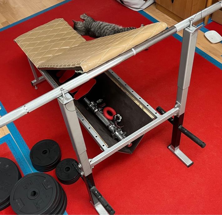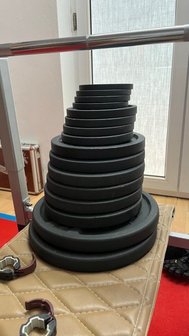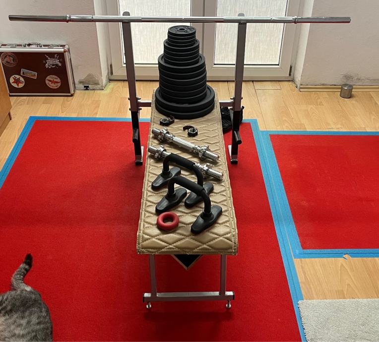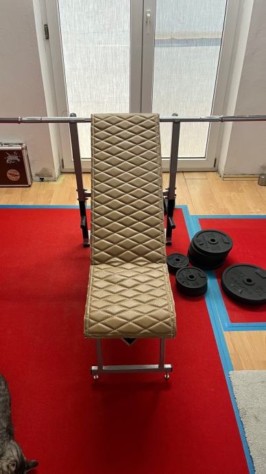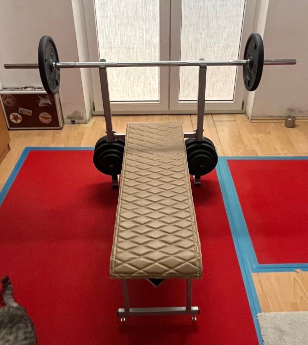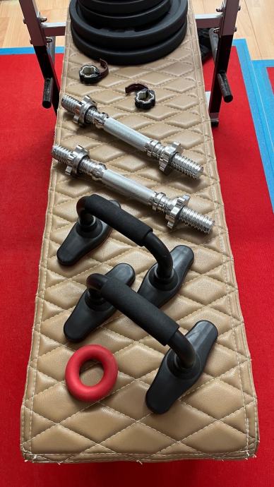 domaći bench press + Šipka za bodybuilding (155 cm 28 mm) + Disk od lijevanog željeza 10 kg x 2kom, 5kg x 6kom, 2kg x 6kom, 1kg x 4kom. kratka šipka za bučice x 2kom. + sve na fotografiji.