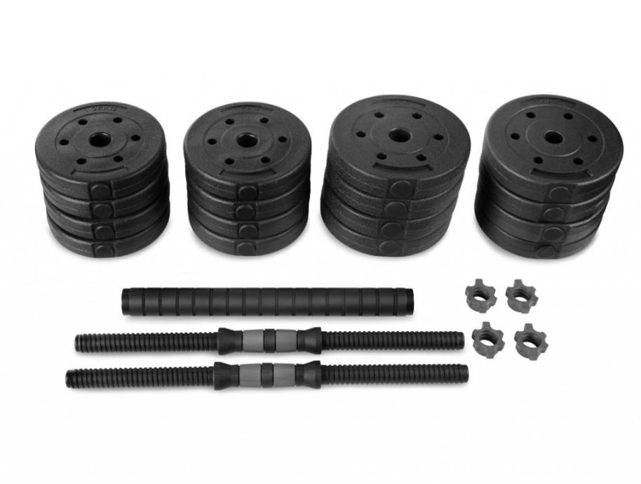 Od seta možemo sastaviti 2x kratke bučice po 15 kg ili jednu dugu šipku težine 30 kg. Cementni diskovi presvučeni čvrstom plastikom.Set sadrži: 2 jednoručne šipkee, 1 spojni dio, 4 štitnika i 16 diskova različitih težina (4x 1,25 kg, 4x 1,5 kg, 4x 2 kg, 4x 2,5 kg).Kratka ručka:Duljina: 51 cmPromjer: 2,5 cmDužina ručke: 13 cmSpojni dio:Prekriveno protukliznom pjenomDuljina: 40 cmPromjer: 4 cmDužina rukohvata: 40 cmUkupna dužina utega: 132 cm