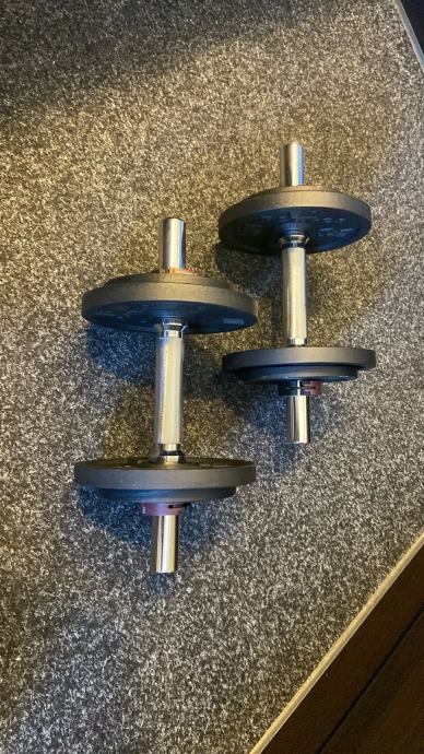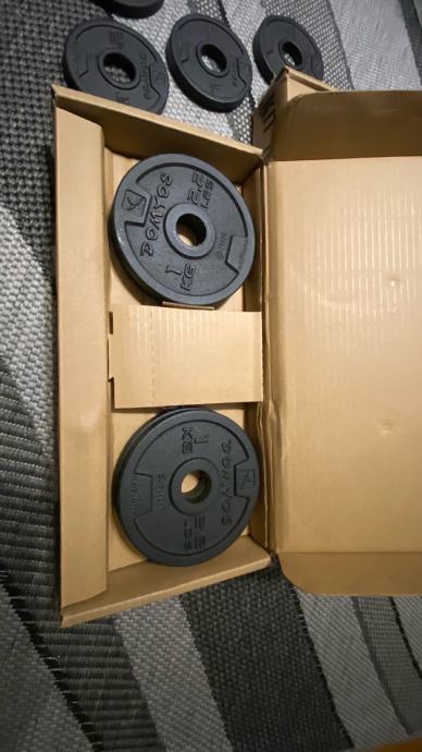 Dva seta utega koje je moguce sastaviti po zeljenoj masi. U setu dolaze ploce za utege: 4 x 0.5 kg, 8 x 1 kg, 4 x 2 kg. U Dechatlonu je moguce kupiti jos ploca po izboru. Samo je otvoreno, nije koristeno.