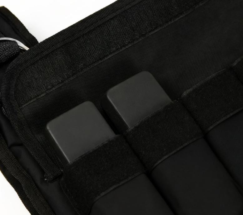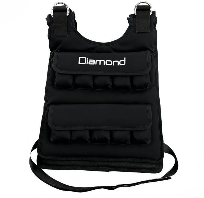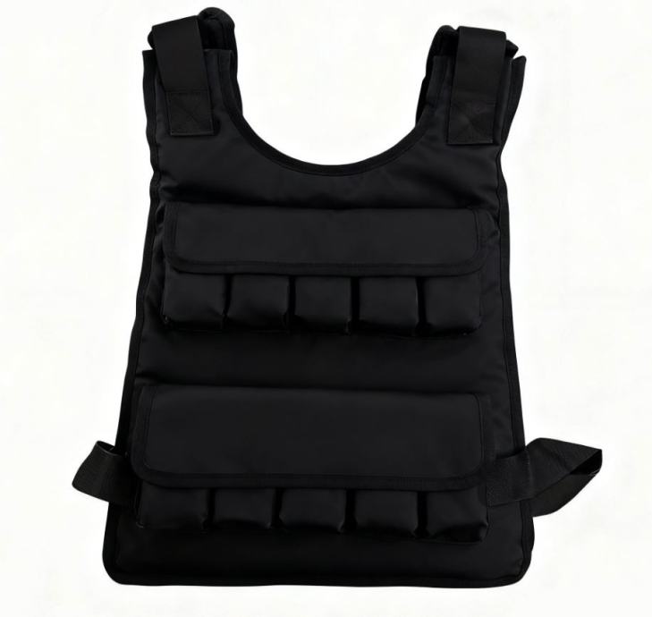 Prsluk s utezima s 8 džepova od cca. 2,5 kg svaki, izrađen od čvrstog materijala. Izvrstan za sve vrste funkcionalnog treninga, trčanje, hodanje. Po potrebi se može zategnuti remenima. Težina je ravnomjerno raspoređena sprijeda i straga.Veća kvaliteta i udobnost tijekom vježbanja.Zatvaranje čičak trakom.