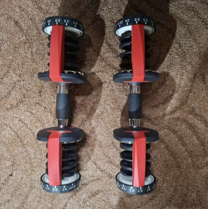 Podesive bučice ukupne težine 48 kg u potpuno novom stanju. Praktične su za kućni trening s mogućnošću prilagodbe težine prema potrebama vježbanja. Moderan dizajn s crveno-crnom kombinacijom boja i kvalitetnom izradom osigurava dugotrajan i siguran trening.