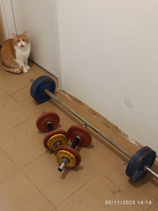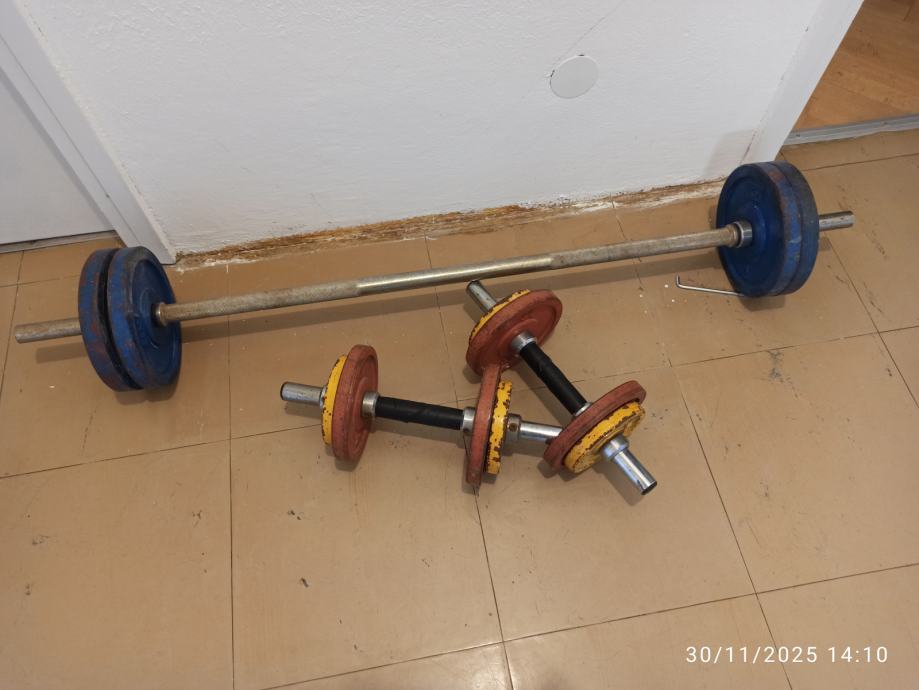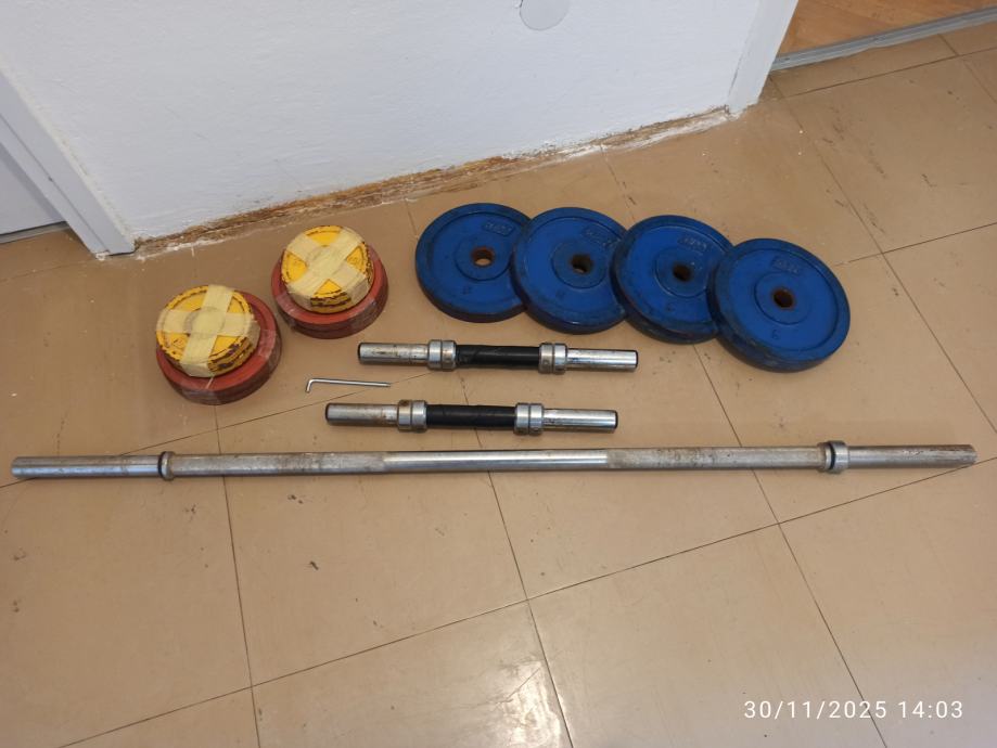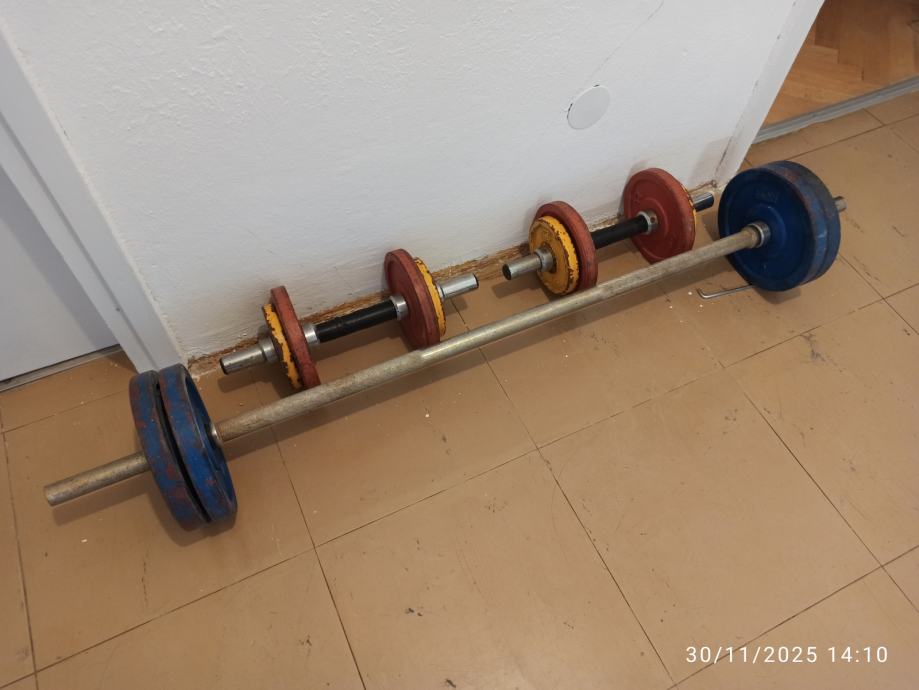 Rabljeni utezi ELAN cca 40kg, šipka 1,4m, 2x manje šipke, 12 diskova.