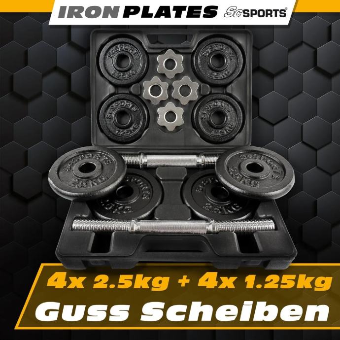 Ovaj profesionalni set sadrži 2 šipke s bučicama s 8 ploča s utezima (4x 2,5 kg i 4x 1,25 kg), koje se lako mogu spremiti u priloženi kovčeg. Bučice su izrađene od visokokvalitetnog lijevanog željeza i imaju nazubljene površine za držanje za siguran hvat tijekom treninga. Ne samo da štede prostor i lako ih je pohraniti, već također omogućuju ciljano vježbanje pojedinih mišićnih skupina za vježbanje cijelog tijela.